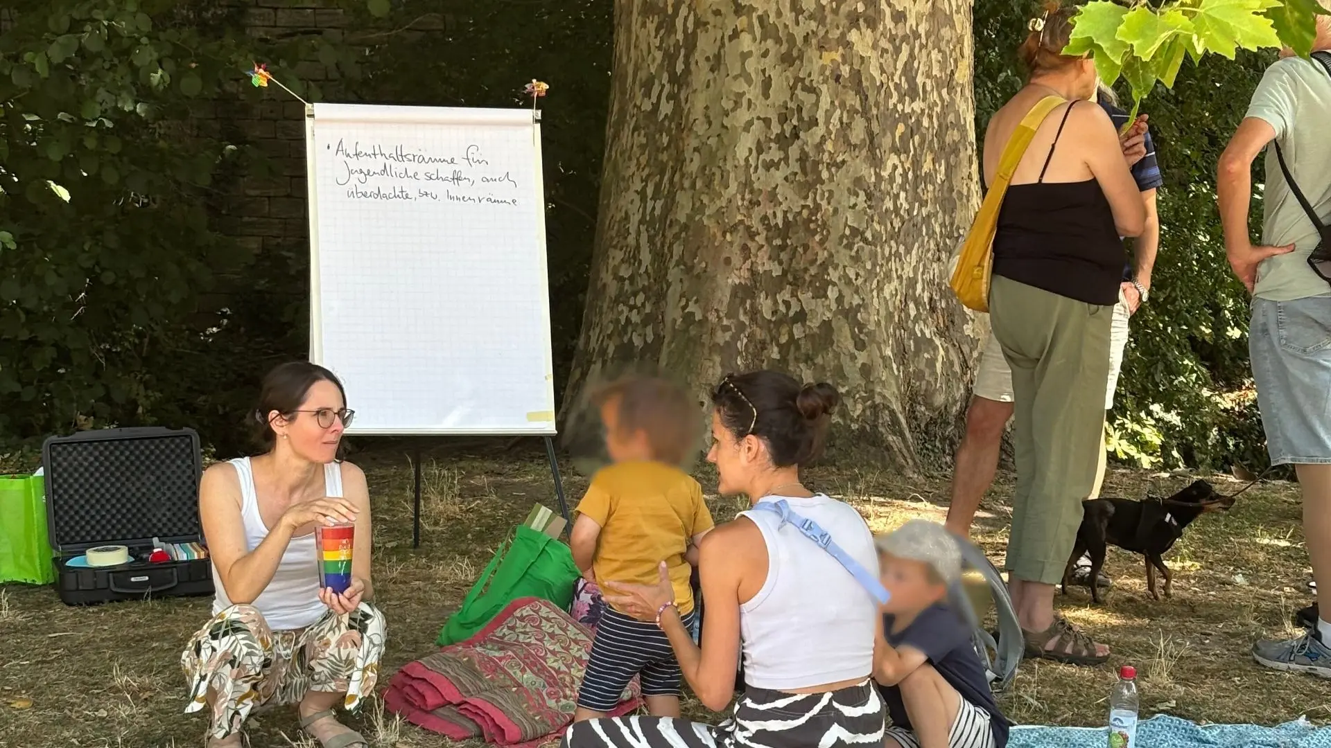 Rund zehn Familien mit kleinen Kindern waren vor Ort – mit Picknickdecken, Sandspielzeug oder dem Laufrad. Auch mehrere Großeltern waren dabei. Mitten im Alltag junger Familien haben wir so einen Rahmen geschaffen, der Austausch ermöglicht, ohne dass eine klassische abendliche Sitzung nötig war: mit Snacks, Getränken, einer Flipchart und vor allem mit offenen Ohren. Organisiert wurde das Treffen von Miriam Weisenburger und Moritz Plathe, die sich als junge Eltern in der Grünen Stadtpolitik engagieren.