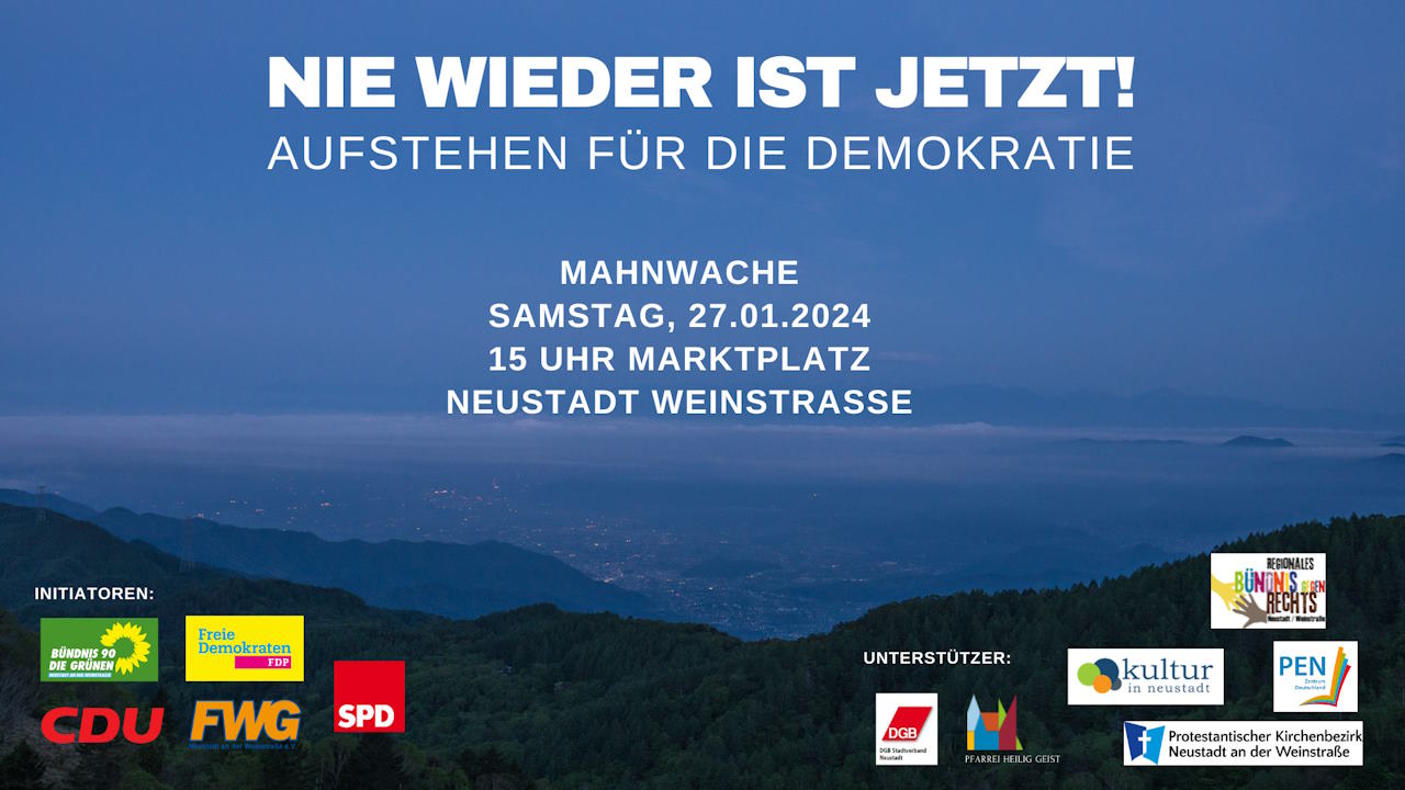 In Neustadt an der Weinstraße wird am Samstag den 27. Januar 2024, 15:00 Uhr, auf dem Marktplatz eine Mahnwache gegen Rechtsextremismus stattfinden, unter dem Motto „NIE WIEDER ist JETZT – Aufstehen für die Demokratie.“ Initiatoren sind alle im Stadtrat vertretenen Fraktionen, der Stadtverband für Kultur sowie das evangelische und katholische Dekanat. Unterstützt wird die Aktion vom Neustadter Sport-Stadtverband, dem Bündnis gegen Rechts mit dem Deutschen Gewerkschaftsbund und der Gedenkstätte für Opfer des Nationalsozialismus, sowie der Regionalgruppe des deutschen PEN.
